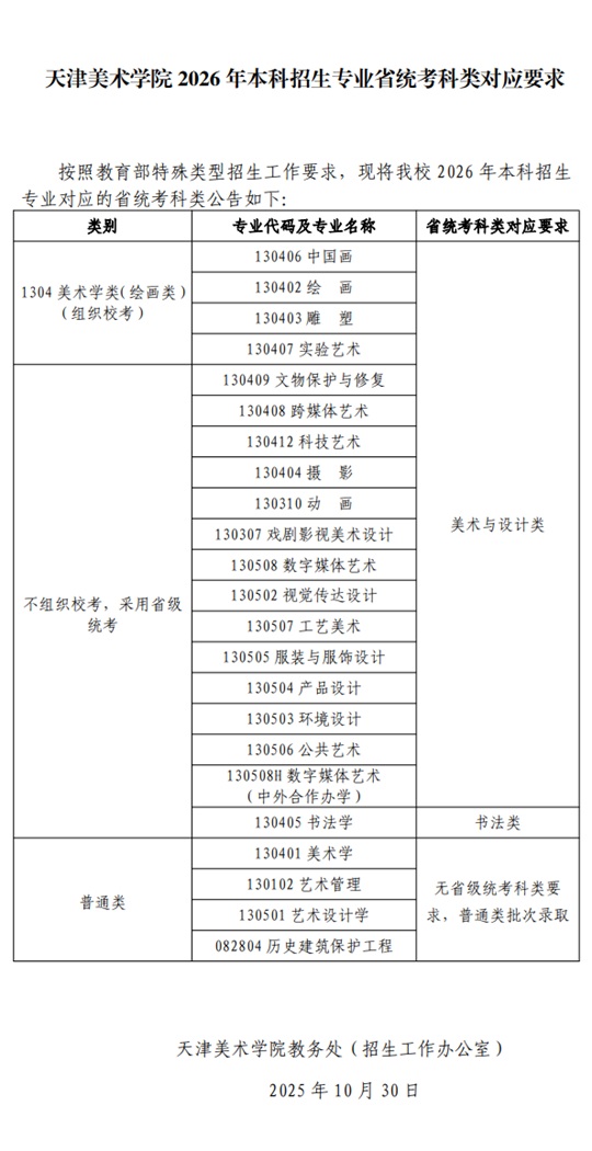 | 天津美術(shù)學(xué)院2026年本科招生專業(yè)省統(tǒng)考科類對應(yīng)要求 |