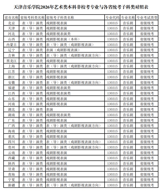| 天津音樂學(xué)院2026年藝術(shù)類本科非?紝I(yè)與各省統(tǒng)考子科類對照表 |