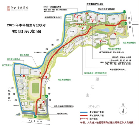 2月23日—25日,學(xué)校開放東1門、東大門、南門、東南門,在綜藝樓(附中樓)、舞蹈樓參加面試考試的考生,建議從浙音路東1門(行車道)或東大門(人行道)進(jìn)入校園;在南區(qū)綜合教學(xué)樓15B參加筆試考試的考生,建議從南門、東南門進(jìn)入校園。如乘坐地鐵6號線到浙江音樂學(xué)院站,可從“浙江音樂學(xué)院南門”進(jìn)入校園。