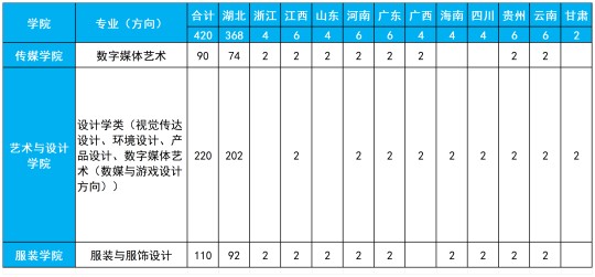 2025年我校計劃招收設計學類本科生420人,文、理兼收。其中,設計學類(視覺傳達設計、環(huán)境設計、產(chǎn)品設計、數(shù)字媒體藝術(數(shù)媒與游戲設計方向))220人,服裝與服飾設計110人,數(shù)字媒體藝術專業(yè)90人。各招生省份分省計劃詳見下表: