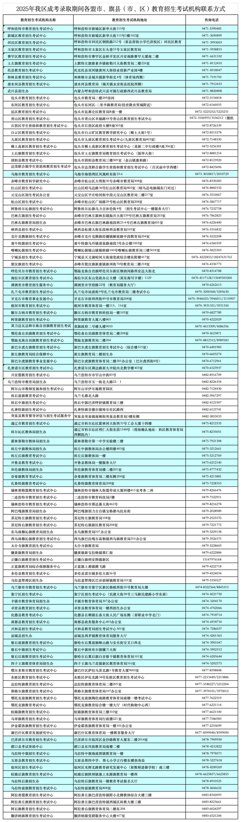 | 2025年內(nèi)蒙古成考錄取期間各盟市、旗縣(市、區(qū))教育招生考試機(jī)構(gòu)咨詢電話 |