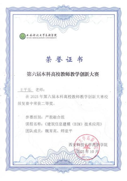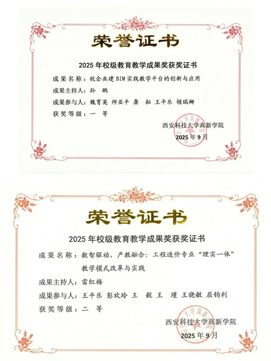 教學(xué)改革持續(xù)深化,創(chuàng)新成果亮點(diǎn)紛呈。在2025年校級教育教學(xué)成果獎評選中,科技與工程學(xué)院牽頭完成的“校企共建BIM實(shí)踐教學(xué)平臺的創(chuàng)新與應(yīng)用”榮獲一等獎,“數(shù)智驅(qū)動,產(chǎn)教融合:工程造價專業(yè)‘理實(shí)一體’教學(xué)模式改革與實(shí)踐”斬獲二等獎,集中體現(xiàn)了學(xué)院在BIM實(shí)踐教學(xué)平臺構(gòu)建、課程體系優(yōu)化、理實(shí)一體化改革等方面的深入探索與顯著成效。在第六屆本科高校教師教學(xué)創(chuàng)新大賽中,王平樂老師領(lǐng)銜、魏育英、師亞平參與的《建筑信息建模(BIM)技術(shù)應(yīng)用》課程,憑借鮮明的產(chǎn)教融合特色與創(chuàng)新的教學(xué)方法,榮獲產(chǎn)教融合組二等獎,進(jìn)一步印證了學(xué)院BIM課程建設(shè)的高水平與教學(xué)創(chuàng)新的持續(xù)突破。