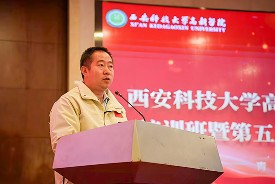 中共延安市寶塔區(qū)委黨校副校長李滔致歡迎詞,他指出,延安精神與西安科技大學高新學院的校風校訓有著深刻的內(nèi)在共鳴,在這里開展“青馬工程”,是將地方紅色資源與高校思政教育有機的連接,能夠讓青年學子在歷史現(xiàn)場感悟真理力量。