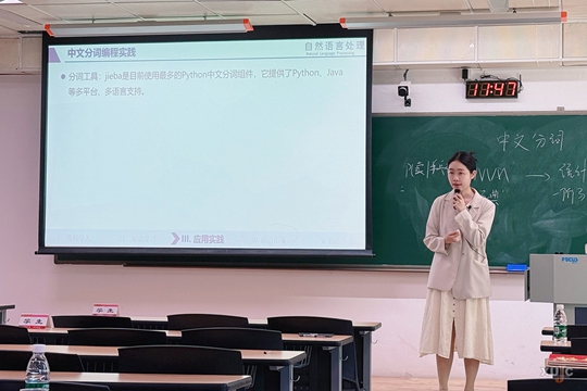 胡鈺琪參賽課程為《自然語言處理》。在決賽現(xiàn)場教學(xué)演示中,她采取情境導(dǎo)入法和問題驅(qū)動法展開教學(xué)。通過對比不同AI應(yīng)用在中英文場景的表現(xiàn)力,她引導(dǎo)同學(xué)們思考科技興國的意義,并導(dǎo)入本堂課的知識學(xué)習(xí)——中文分詞。以“乒乓球拍賣完了”這句話如何正確進(jìn)行中文分詞為懸念,她激發(fā)了同學(xué)們的好奇心,進(jìn)一步深入講解了課程內(nèi)容的應(yīng)用場景。在教學(xué)過程中,她通過一系列環(huán)環(huán)相扣的問題鏈,如“計算機如何分詞”“FMM方法為何無法解決新問題”“基于統(tǒng)計的分詞算法計算量過大怎么辦”等,將知識點逐一呈現(xiàn),緊貼當(dāng)下人工智能熱點。