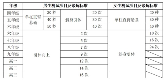 為有效提升學(xué)生上肢力量,結(jié)合本市學(xué)生實(shí)際情況,制定不同年級(jí)鍛煉標(biāo)準(zhǔn),請(qǐng)參照?qǐng)?zhí)行。