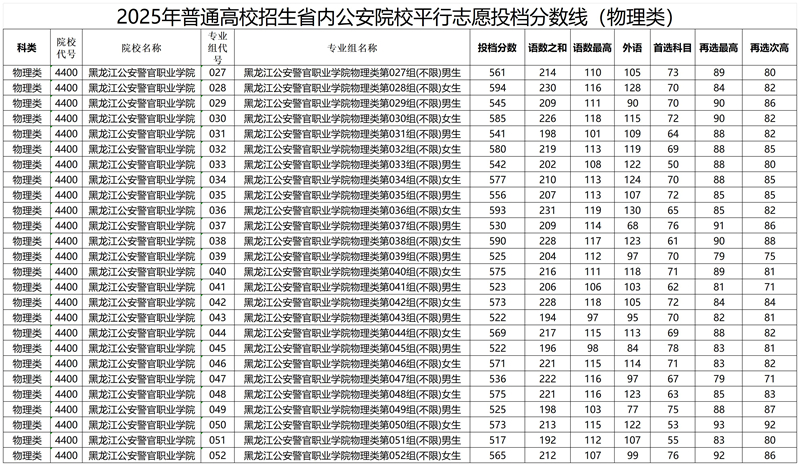 2025年黑龍江省普通高校招生提前批省內(nèi)公安院校于7月17日進(jìn)行平行志愿投檔,現(xiàn)公布院校專業(yè)組投檔分?jǐn)?shù)線。