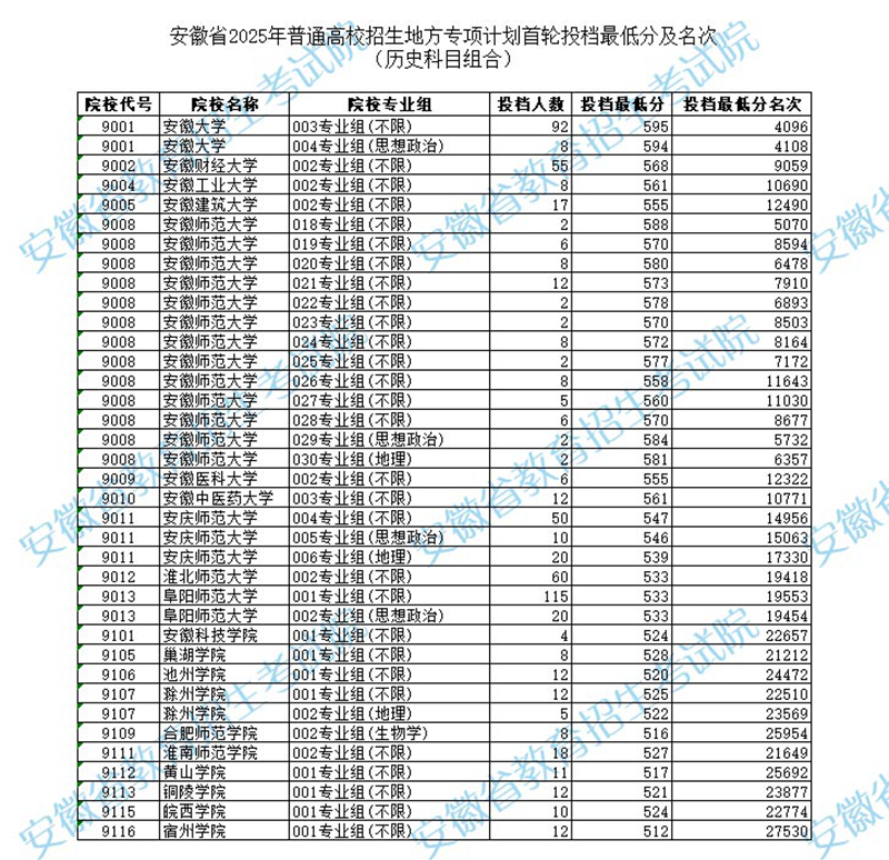 安徽省2025年普通高校招生地方專項計劃首輪投檔最低分及名次(歷史科目組合)