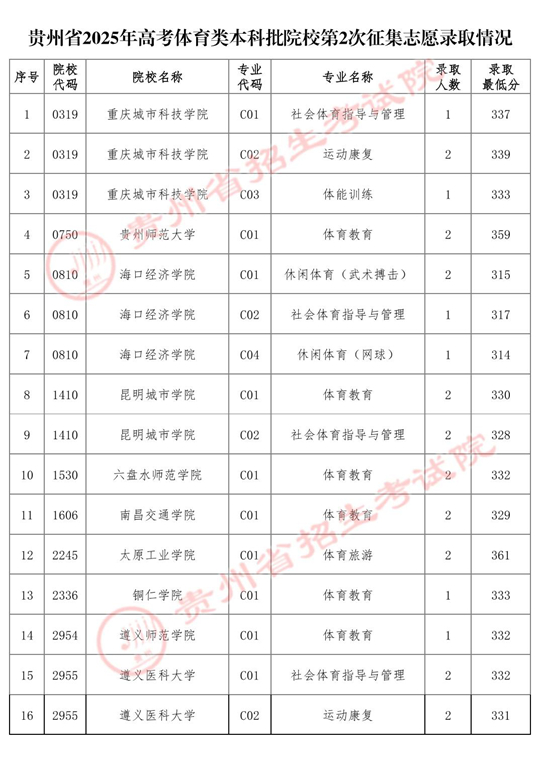 | 貴州省2025年高考體育類本科批院校第2次征集志愿錄取情況 |