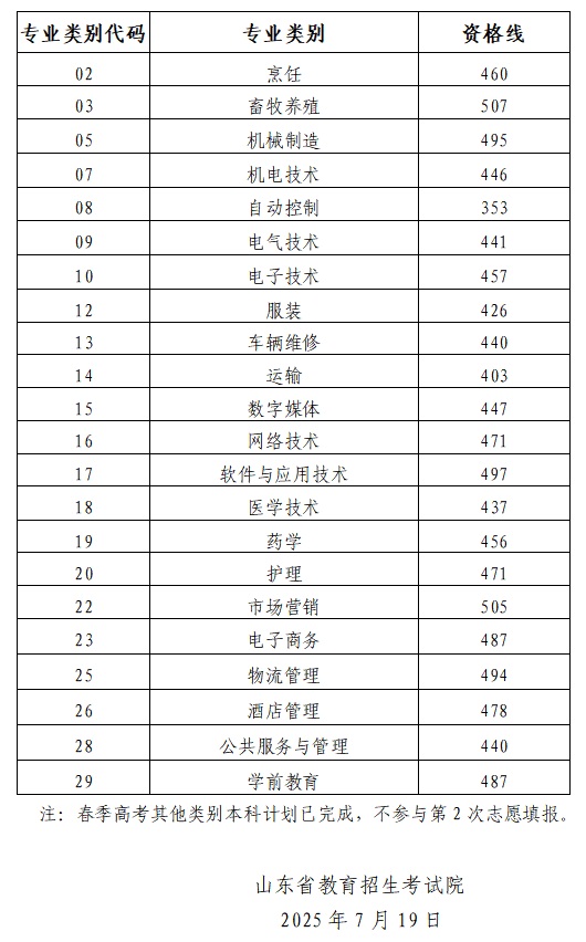 山東省2025年春季高考本科批第2次志愿填報資格線