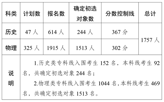 6月25日至30日,全區(qū)2866名考生填報定向培養(yǎng)軍士志愿,符合招收條件2529人,按照本科線報名考生直接確定為體格檢查和政治考核初選對象,?凭考生以考分從高到低的順序,按招收計劃數(shù)3.2倍比例劃定入圍分數(shù)線,共確定初選對象1757人,具體公布如下: