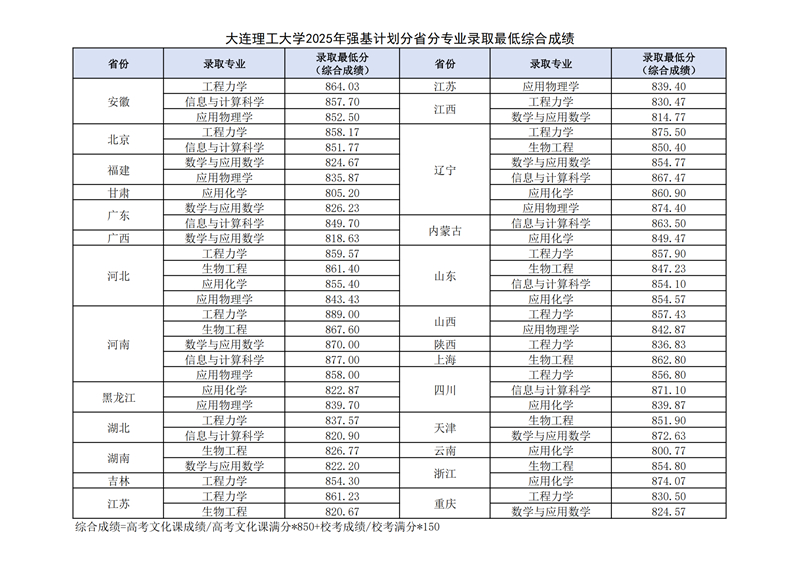 | 大連理工大學(xué)2025年強(qiáng)基計(jì)劃分省分專業(yè)錄取最低綜合成績(jī) |