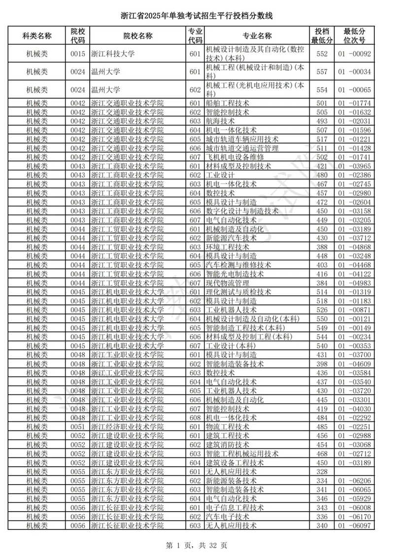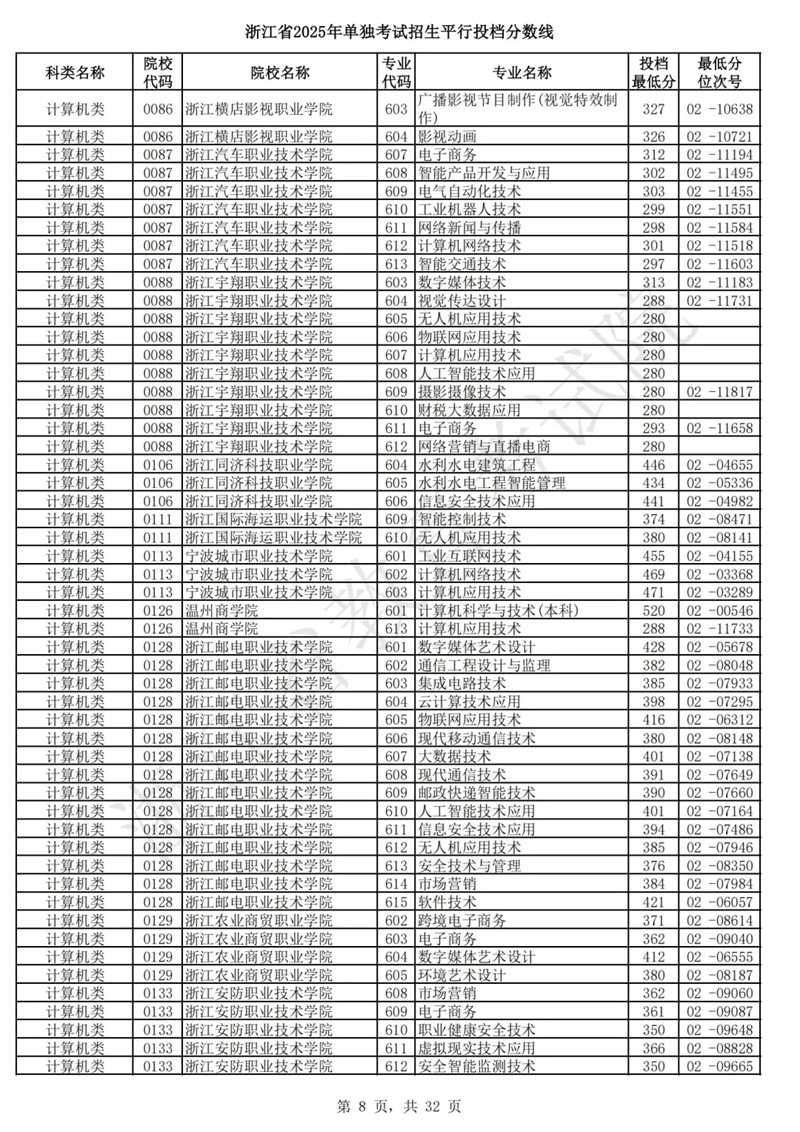 | 浙江省2025年單獨考試招生平行投檔分數線 |