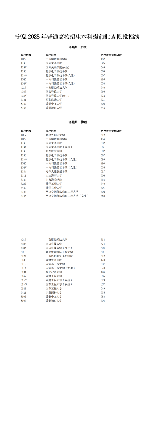 | 寧夏2025年普通高校招生本科提前批A段投檔線 |