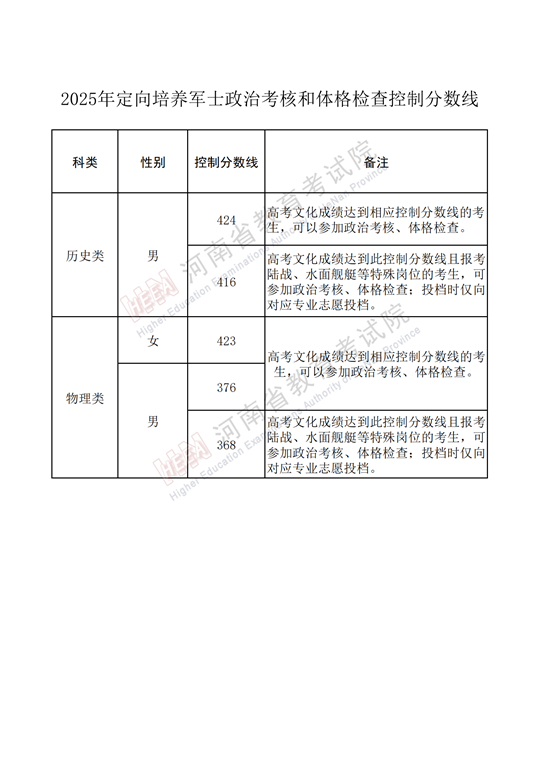 | 河南省2025年普通高校招生定向培養(yǎng)軍士政治考核和體格檢查控制分?jǐn)?shù)線 |