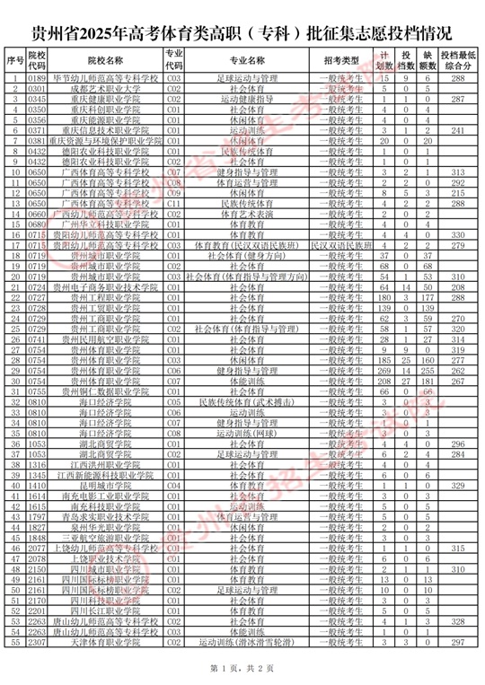 貴州省2025年高考體育類高職(專科)批征集志愿投檔情況