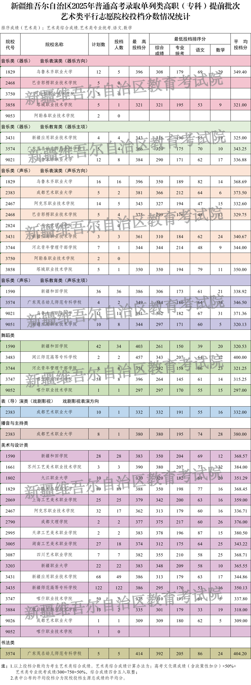| 新疆維吾爾自治區(qū)2025年普通高校招生單列類高職(專科)提前批次藝術(shù)類投檔情況 |