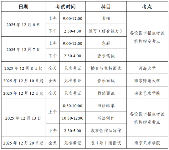 | 江蘇省2026年普通高校招生藝術(shù)類專業(yè)省統(tǒng)考時(shí)間及考點(diǎn)安排 |