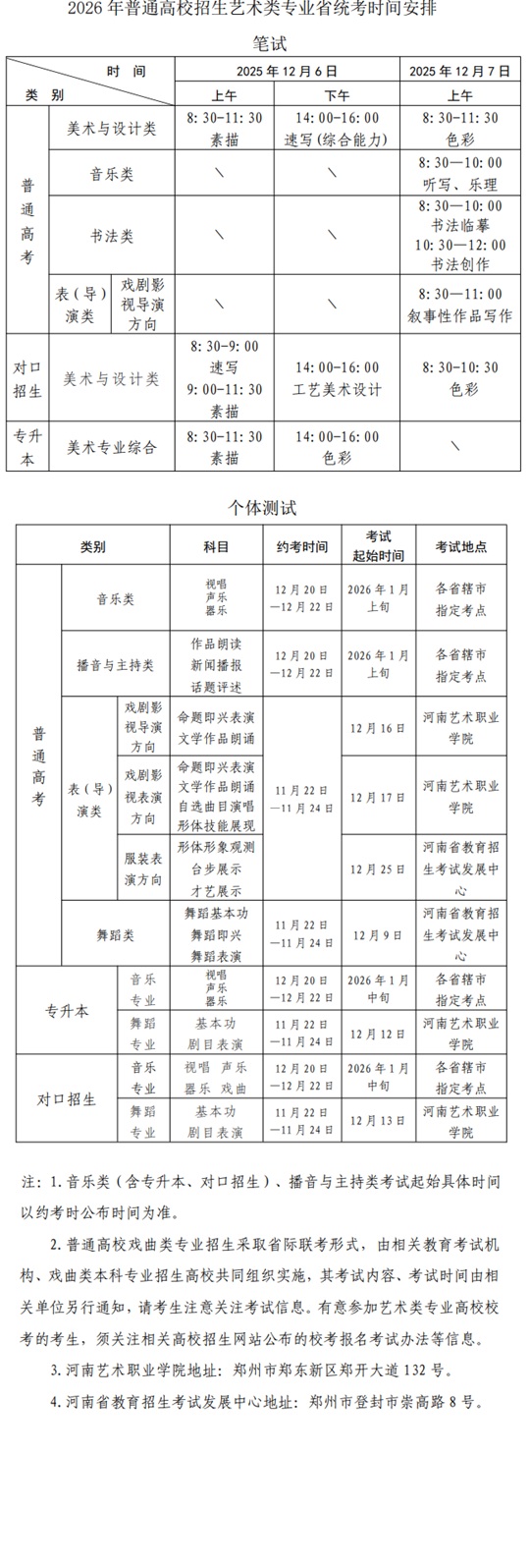 一、靜心做好考前準(zhǔn)備。請(qǐng)全省藝術(shù)類考生認(rèn)真閱讀河南省教育考試院官方網(wǎng)站(https://www.haeea.cn)發(fā)布的相應(yīng)考試說明,普通高考藝術(shù)類考生請(qǐng)認(rèn)真閱讀《河南省2026年普通高校招生藝術(shù)類專業(yè)考試有關(guān)事宜的說明》與各專業(yè)科類省級(jí)統(tǒng)考考試要求及注意事項(xiàng),專升本藝術(shù)類考生請(qǐng)認(rèn)真閱讀《河南省教育考試院發(fā)布2026年普通高等學(xué)校專升本考試招生工作實(shí)施辦法》與相關(guān)專業(yè)考試說明,對(duì)口招生藝術(shù)類考生請(qǐng)認(rèn)真閱讀《河南省2026年普通高等學(xué)校對(duì)口招收中等職業(yè)學(xué)校畢業(yè)生工作相關(guān)事宜問答》與相關(guān)專業(yè)考試說明。具體考試時(shí)間安排附后,請(qǐng)考生提前熟悉各專業(yè)考試規(guī)則,合理規(guī)劃考前學(xué)習(xí)和生活,注意飲食、作息和自身安全,保持良好身心狀態(tài),自信迎接考試。