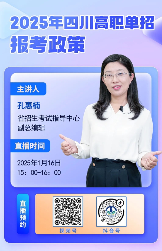 本期直播將聚焦2025年四川高職單招,為考生和家長們解讀2025年高職單招政策、分析報考策略。直播期間,我們還會在線答疑,為考生和家長朋友們解惑,大家有關于高職單招的疑問都可以在直播間留言咨詢哦——