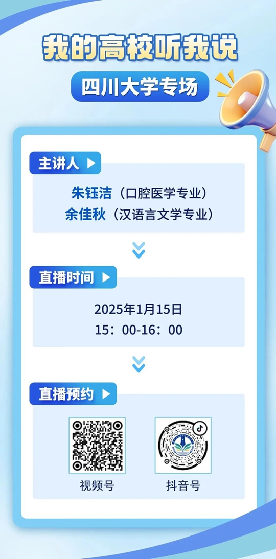 明天(1月15日),“我的高校聽我說”首播將由來自四川大學的同學傾情分享。這是一場全方位了解四川大學和深入認識口腔醫(yī)學、漢語言文學專業(yè)的絕佳機會,不要錯過哦!