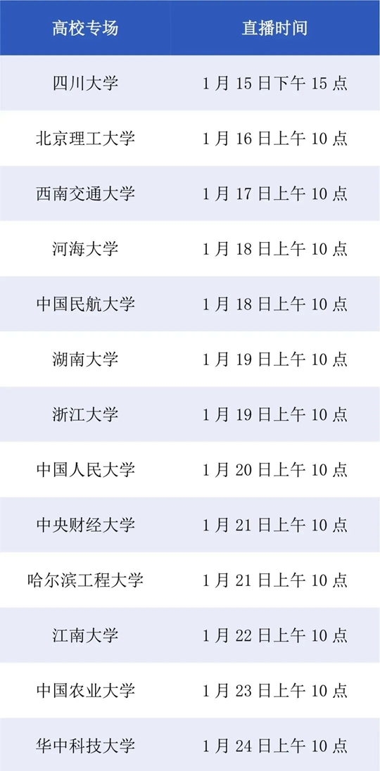 本系列直播活動將分為兩期開展,第一期為1月15日-24日。以下是第一期直播參與高校的詳細安排表,快來pick你心儀的大學吧——