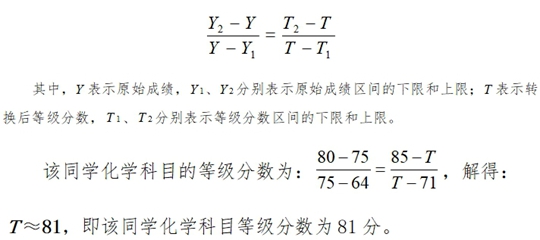 例如,某同學(xué)化學(xué)科目原始成績(jī)?yōu)?5分,按照原始成績(jī)排序,等級(jí)比例應(yīng)劃分到B等級(jí),而該科目B等級(jí)的原始成績(jī)分布區(qū)間為80——64,等級(jí)分?jǐn)?shù)區(qū)間為85——71,按照轉(zhuǎn)換公式: