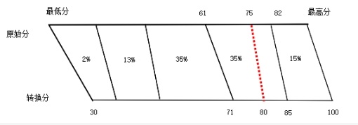 第一步,將該科目考生卷面原始分從高到低依次按照15%、35%、35%、13%和2%的比例劃分為A、B、C、D、E共5個等級,考生的原始分轉(zhuǎn)換成等級。缺考、零分考生人數(shù)不計入轉(zhuǎn)換基數(shù),違規(guī)或作弊考生計入轉(zhuǎn)換基數(shù),但轉(zhuǎn)換后的成績按零分計。