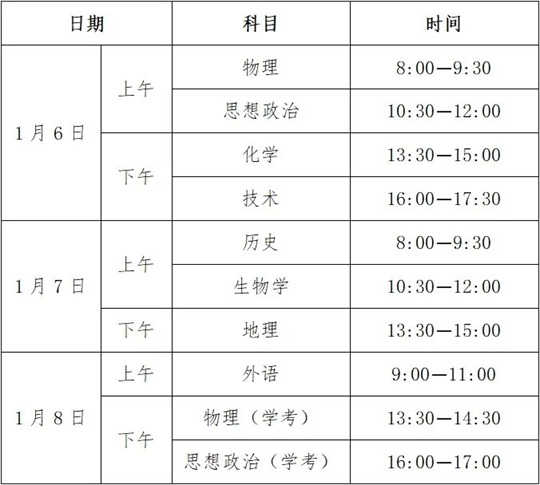 考試當(dāng)天,考生須憑準(zhǔn)考證和身份證按規(guī)定時(shí)間和地點(diǎn)參加考試。需注意的是,本次物理和思想政治科目學(xué)考安排在選考結(jié)束后8日下午進(jìn)行。各科目考試時(shí)間如下:
