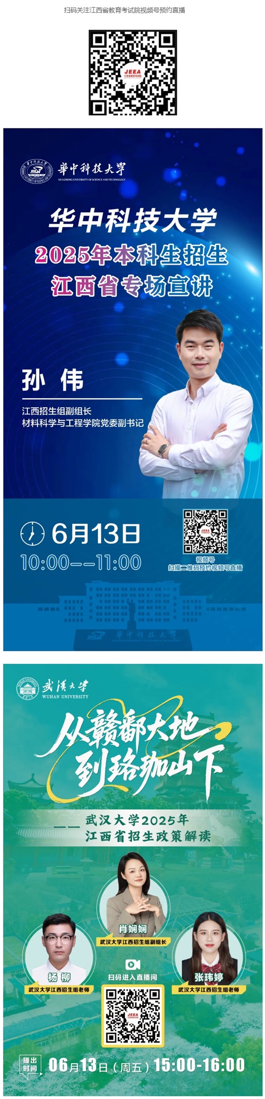 6月13日,江西省教育考試院2025年“高考直通車(chē)”線上直播將先后迎來(lái)華中科技大學(xué)、武漢大學(xué)兩所高校,招生老師將在直播間為您答疑解惑!