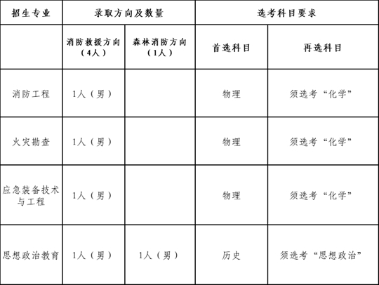 2025年中國消防救援學院在贛招收5名青年學生,均為男生,其中:消防救援方向4名(消防工程、火災勘查、應急裝備技術與工程、思想政治教育專業(yè)各1名),森林消防方向1名(思想政治教育專業(yè))。