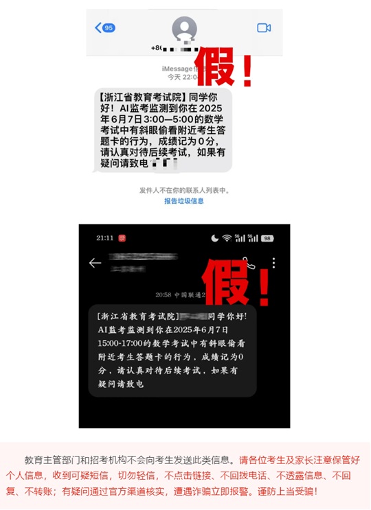 我省2025年高考正在進(jìn)行中,部分考生收到了所謂“浙江省教育考試院”的短信,稱在考試中被AI監(jiān)考發(fā)現(xiàn)其有違規(guī)行為,成績記為0分。