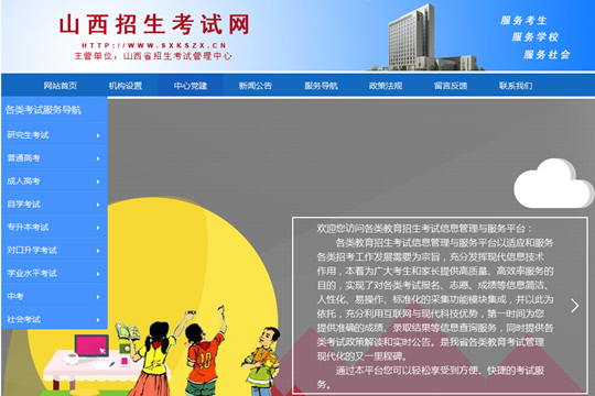 山西招生考試網(wǎng)(http://www.sxkszx.cn)是山西省各類教育招生考試信息發(fā)布、信息采集的重要平臺(tái),是山西省對(duì)口升學(xué)考試網(wǎng)上填報(bào)志愿的唯一網(wǎng)站。