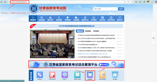 訪問甘肅省教育考試院官網(wǎng)https://www.ganseea.cn,點擊“信息查詢”模塊進(jìn)入“高考錄取查詢”頁面進(jìn)行查詢;也可點擊甘肅省教育考試院官網(wǎng)“甘肅省國家教育考試綜合管理平臺”長圖,訪問“考生入口”并登錄后進(jìn)行查詢。