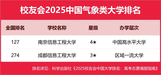 榜單顯示,在校友會(huì)2025中國(guó)大學(xué)排名中,南京信息工程大學(xué)全國(guó)排名第127名,雄居校友會(huì)2025中國(guó)氣象類大學(xué)排名第一。成都信息工程大學(xué)第二。