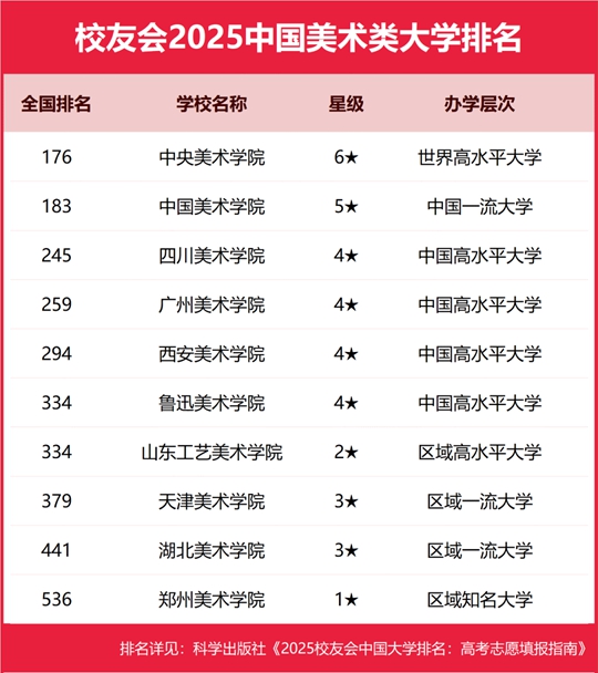 榜單顯示,在校友會2025中國大學(xué)排名中,中央美術(shù)學(xué)院全國排名第176名,雄居校友會2025中國美術(shù)類大學(xué)排名第一。中國美術(shù)學(xué)院第二,四川美術(shù)學(xué)院第三,廣州美術(shù)學(xué)院第四,西安美術(shù)學(xué)院第五。