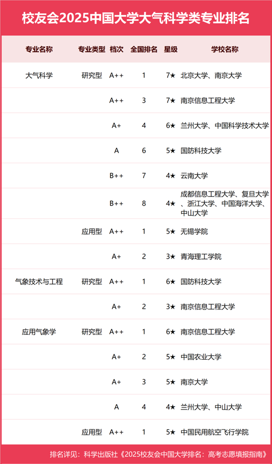 校友會2025中國大學大氣科學類專業(yè)排名(研究型)