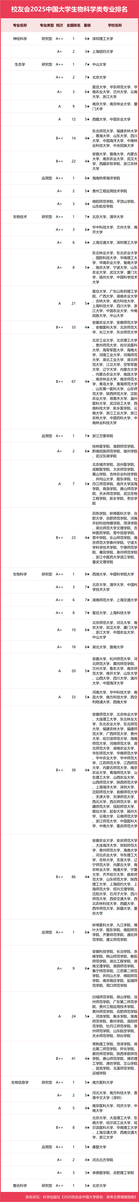 校友會2025中國大學(xué)生物科學(xué)類專業(yè)排名(研究型)