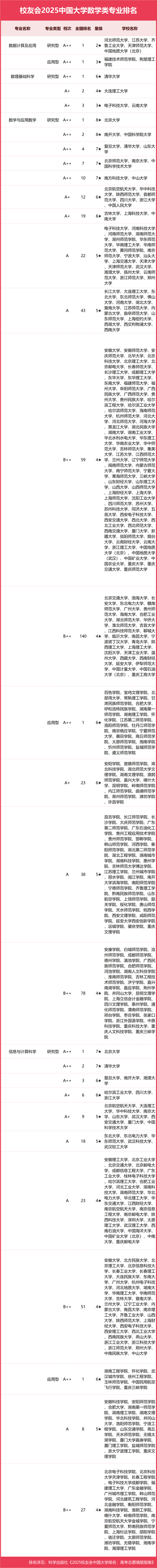校友會2025中國大學(xué)數(shù)學(xué)類專業(yè)排名(研究型)