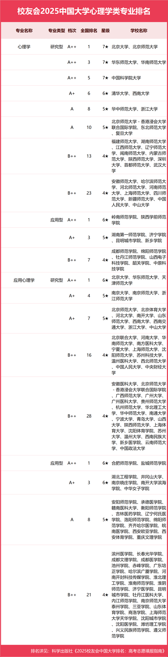 校友會(huì)2025中國(guó)大學(xué)心理學(xué)類專業(yè)排名(研究型)