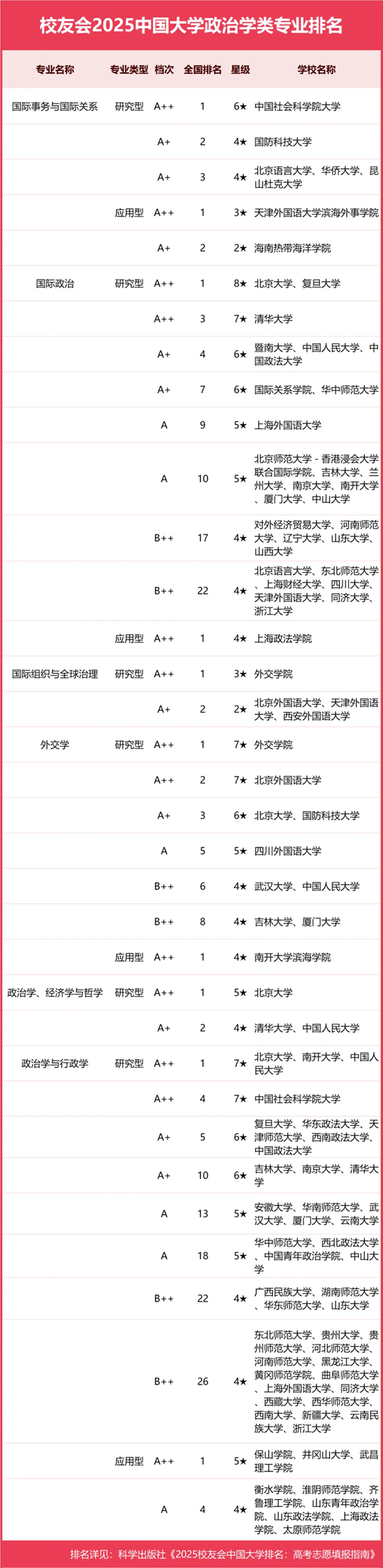 校友會2025中國大學(xué)政治學(xué)類專業(yè)排名(研究型)