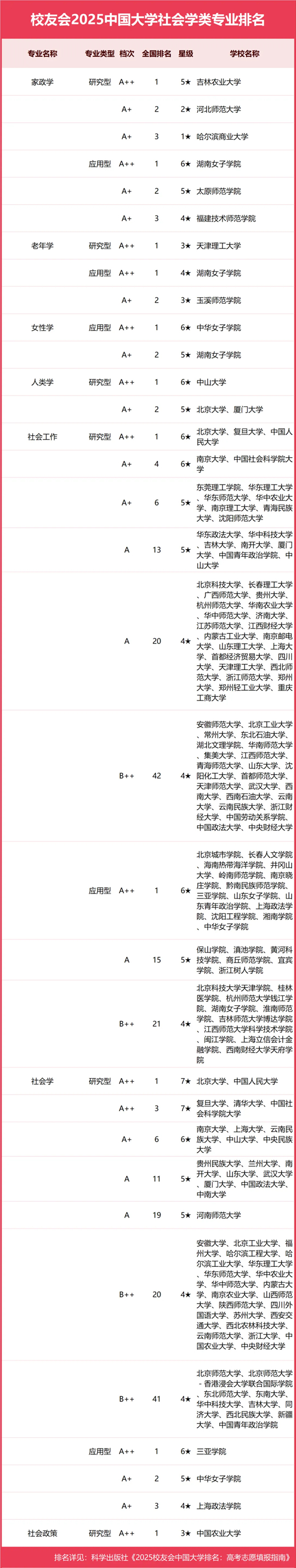 校友會2025中國大學(xué)社會學(xué)類專業(yè)排名(研究型)