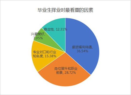 關(guān)于擇業(yè)看重因素,在參與調(diào)查的畢業(yè)生中,表示最看重薪資福利待遇的占到36.54%,最看重晉升空間職業(yè)發(fā)展前景的占28.72%,15.38%的畢業(yè)生最關(guān)注專業(yè)對(duì)口和行業(yè)內(nèi)知名度,7.05%的畢業(yè)生認(rèn)為應(yīng)該遵循自己的興趣愛好,還有12.31%的畢業(yè)生看重工作的穩(wěn)定性。