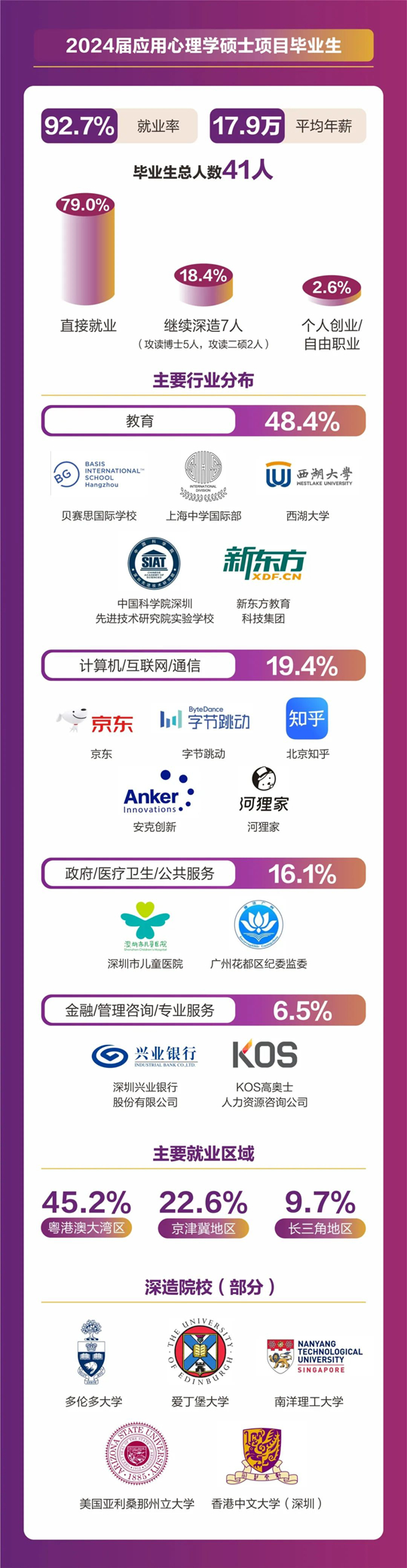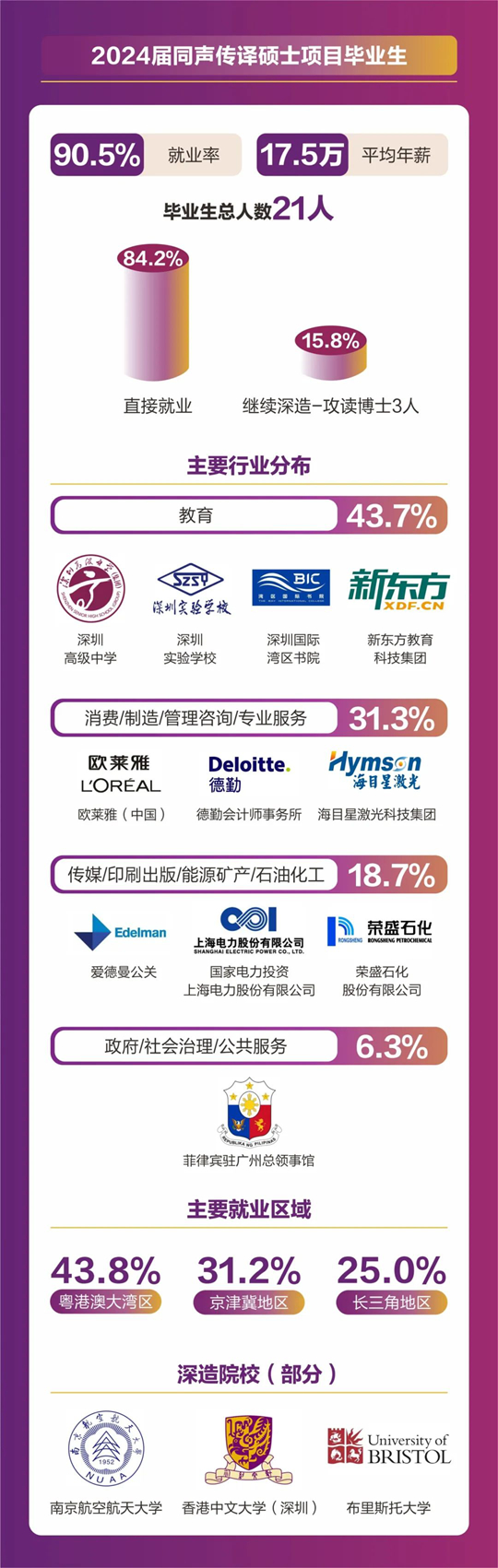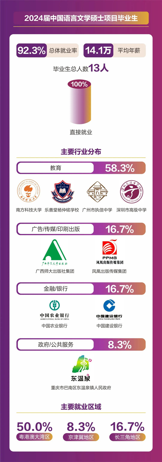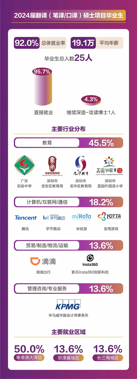 人文社科學(xué)院碩士畢業(yè)人數(shù)共計(jì)157人,分別來自翻譯(筆譯/口譯)、同聲傳譯、應(yīng)用心理學(xué)、全球研究、中國語言文學(xué)等5個(gè)碩士項(xiàng)目。2024屆碩士畢業(yè)生總體就業(yè)率達(dá)到92.36%,平均年薪為18. 4萬元。其中86.2%畢業(yè)生選擇直接就業(yè),畢業(yè)生就業(yè)行業(yè)分布廣泛,涵蓋了教育、計(jì)算機(jī)/互聯(lián)網(wǎng)/通信、貿(mào)易/消費(fèi)/制造/營運(yùn)、金融/銀行/證券/基金、政府/社會治理/公共服務(wù)、廣告/傳媒/印刷出版、管理咨詢/專業(yè)服務(wù)、能源礦產(chǎn)/石油化工/環(huán)保、醫(yī)藥生物/醫(yī)療衛(wèi)生、物流/運(yùn)輸?shù)榷鄠(gè)行業(yè)領(lǐng)域。就業(yè)地點(diǎn)主要集中在粵港澳大灣區(qū)、京津冀區(qū)以及長三角地區(qū)等一線城市及生活圈。11%的學(xué)生則選擇繼續(xù)深造,其中12人將在境內(nèi)外知名院校攻讀博士學(xué)位。