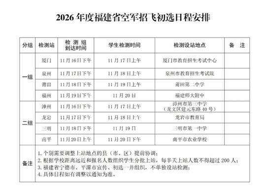 根據(jù)2026年度空軍招飛工作安排,11月17日至11月20日,空軍招飛局南京選拔中心將派初選組赴福建省各地市對報考空軍飛行學員的學生進行檢測。