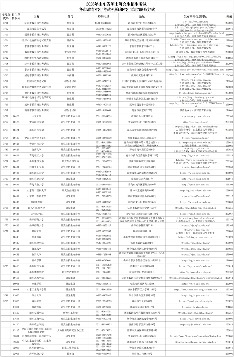 | 2026年山東省碩士研究生招生考試各市教育招生考試機(jī)構(gòu)及招生單位聯(lián)系方式 |