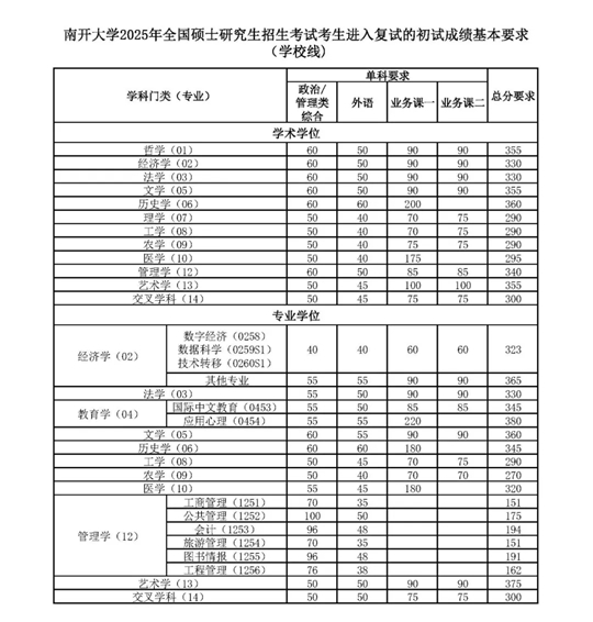 南開大學(xué)2025年全國碩士研究生招生考試考生進(jìn)入復(fù)試的初試成績基本要求(學(xué)校線)公布。