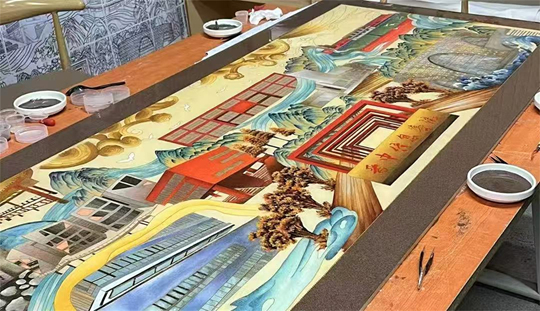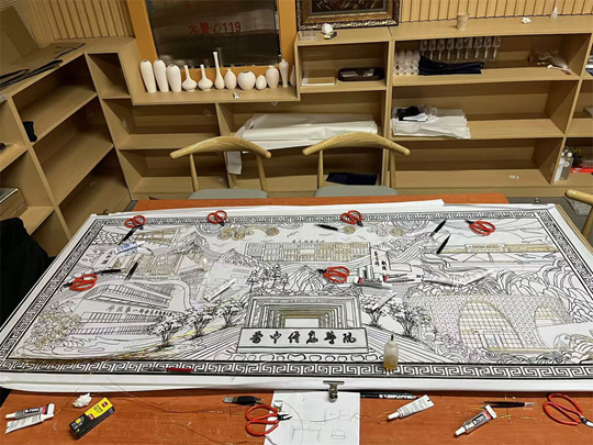 掐絲琺瑯作品《遇見信院》以校園場景為創(chuàng)作基底,依托花絲琺瑯這一非遺技藝,將課堂時光、校園景致等專屬青春記憶,轉化為可觸摸、可觀賞的實體作品。學生非遺研究員崔宇悅介紹到“這件集體創(chuàng)作的作品,既凝聚了同學們對校園生活的共同情感共鳴,通過學生創(chuàng)作者的全新表達,讓花絲琺瑯這一傳統(tǒng)技藝在新時代語境下煥發(fā)新的活力,更展現(xiàn)了學校在非遺特色育人實踐中的積極探索!