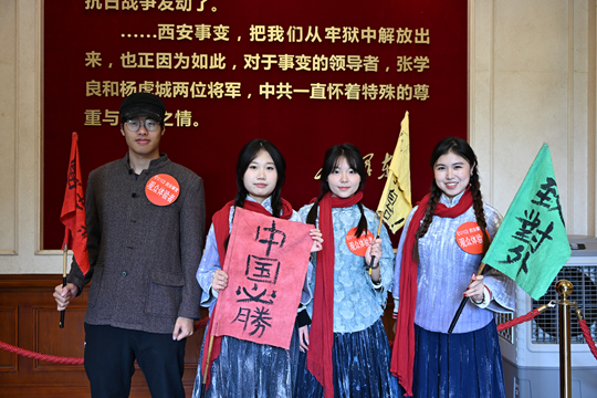 華清宮的亭臺(tái)樓閣間,百年前的歷史風(fēng)云仿佛觸手可及。學(xué)生們身著民國(guó)風(fēng)格服飾,手持旗幟,走進(jìn)《1212西安事變》演出的瑤光閣劇場(chǎng)。隨著大幕拉開,先進(jìn)的舞臺(tái)技術(shù)與演員的精彩演繹,將1936年冬日那個(gè)驚心動(dòng)魄的夜晚——張學(xué)良、楊虎城兩位將軍發(fā)動(dòng)“兵諫”、“逼蔣抗日”的歷史瞬間,立體地呈現(xiàn)在眾人眼前。