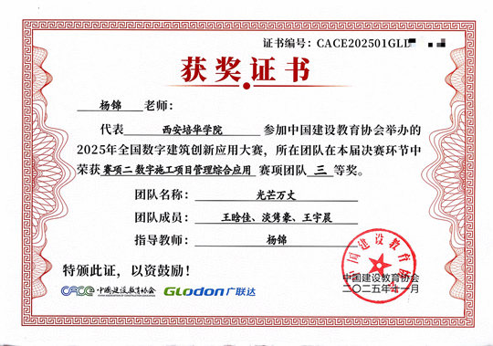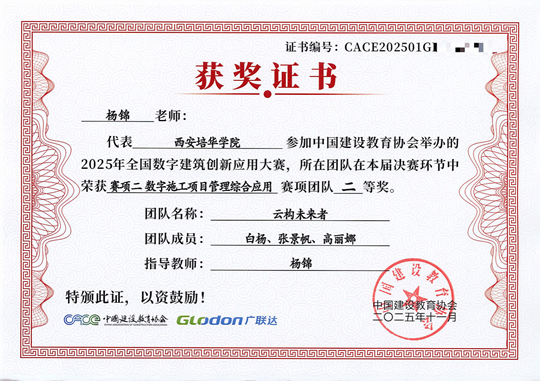 此次獲獎(jiǎng)是對(duì)西安培華學(xué)院數(shù)字建筑教學(xué)成果的肯定,也是"以賽促學(xué)、以賽促教、以賽促創(chuàng)"育人機(jī)制的實(shí)踐。未來,工程造價(jià)專業(yè)將深化"新工科"建設(shè),聚焦數(shù)字建筑前沿,推動(dòng)產(chǎn)學(xué)研融合,完善實(shí)踐教學(xué),培養(yǎng)兼具創(chuàng)新與實(shí)踐能力的復(fù)合型人才,助力"數(shù)字中國(guó)"戰(zhàn)略與建筑產(chǎn)業(yè)升級(jí)。(作者:宋勝男)