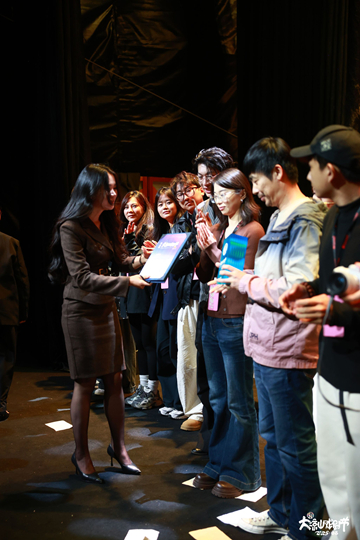 演出圓滿落幕之際,鋰洋主任代表《筆尖·心跳》劇組,滿懷誠(chéng)摯地向大涼山國(guó)際戲劇節(jié)組委會(huì)以及所有到場(chǎng)觀眾致以最深切的謝意。他借邛海天空中的云這一充滿詩(shī)意與希望的意象,抒發(fā)感慨:只要有云,天空就會(huì)美麗;只要有戲,世界就更美好美好。大涼山戲劇節(jié)組委會(huì)代表趙建雪上臺(tái),將象征榮譽(yù)的名牌與證書授予《筆尖·心跳》劇組,現(xiàn)場(chǎng)掌聲雷動(dòng),將這份榮耀與喜悅推向高潮。
